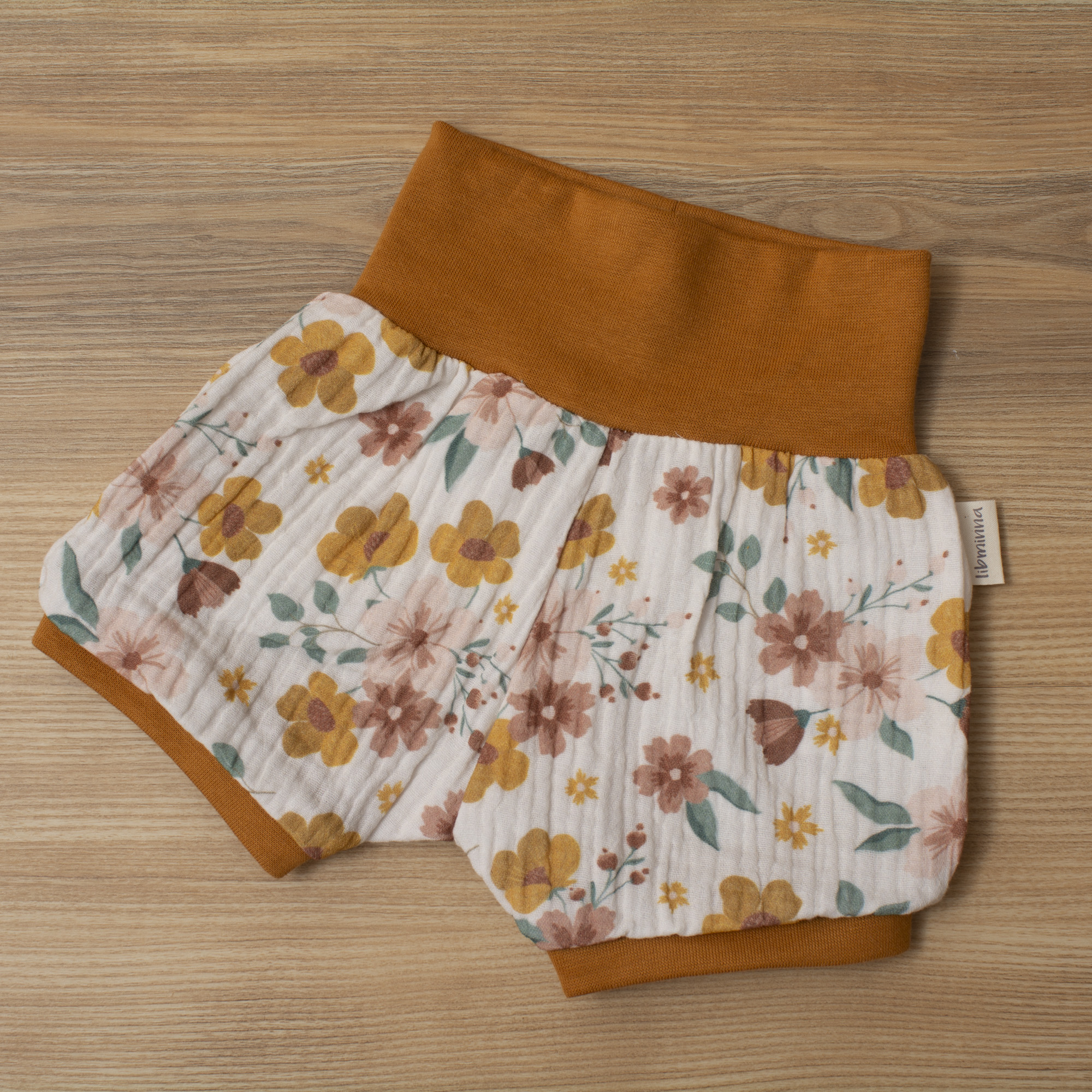 Was ich dir noch sagen möchte: Die Hose ist mega bequem. Das Bauchbündchen ist breit und sehr dehnbar. So engt es nicht ein. Ganz wunderbar für unsere kleinen Wunder. Die Sommerhose verdeckt super herzig den Windelpopo. 🙂