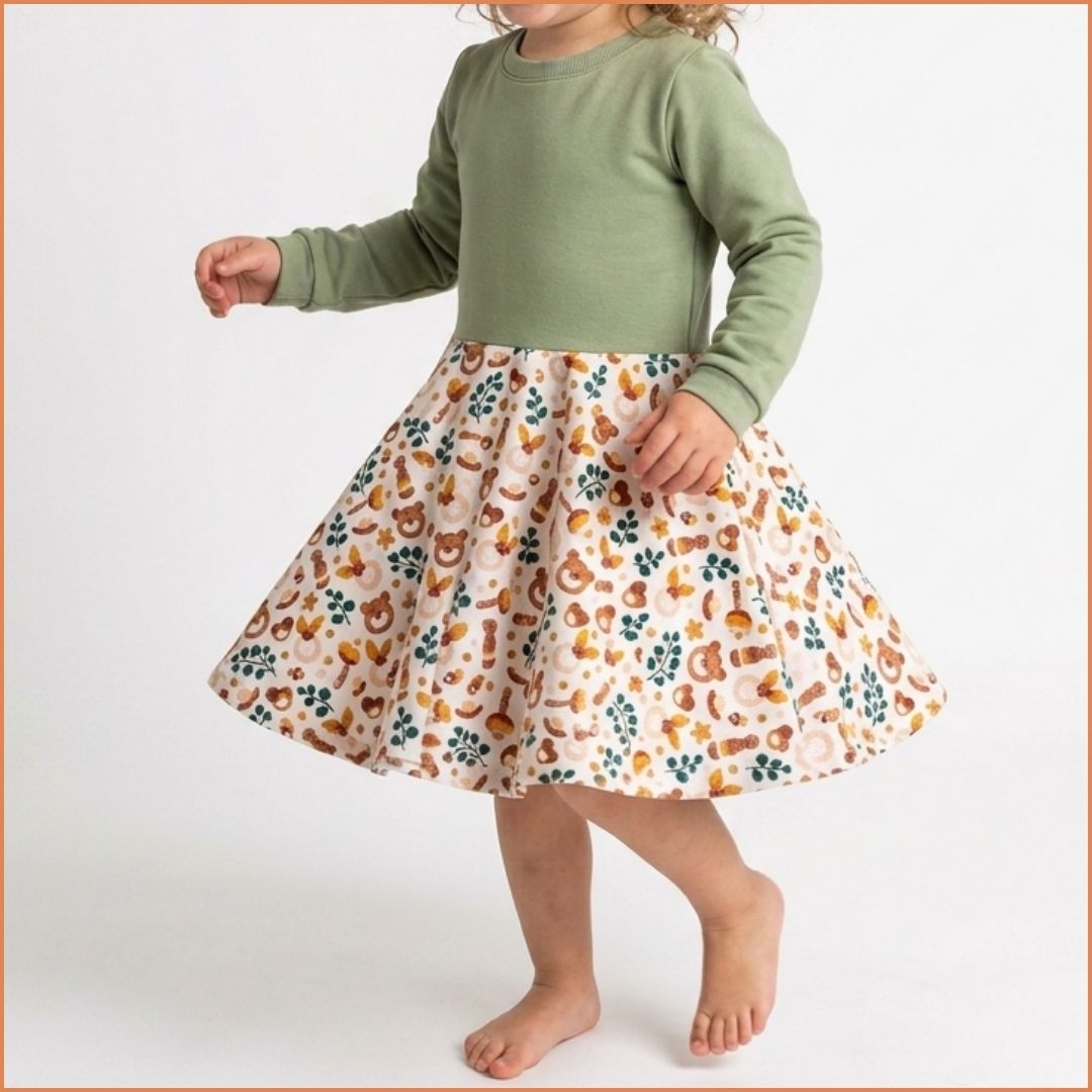 Was ich dir noch sagen möchte: Das Übergangskleid sitzt oben körpernah und weitet sich nach unten in einen weit schwingenden Tellerrock. Das Oberteil ist mit Bündchen genäht und legt sich dadurch schön am Körper an. Es eignet sich durch seine schlichte Art sowohl für den Alltag als auch für besondere Anlässe.